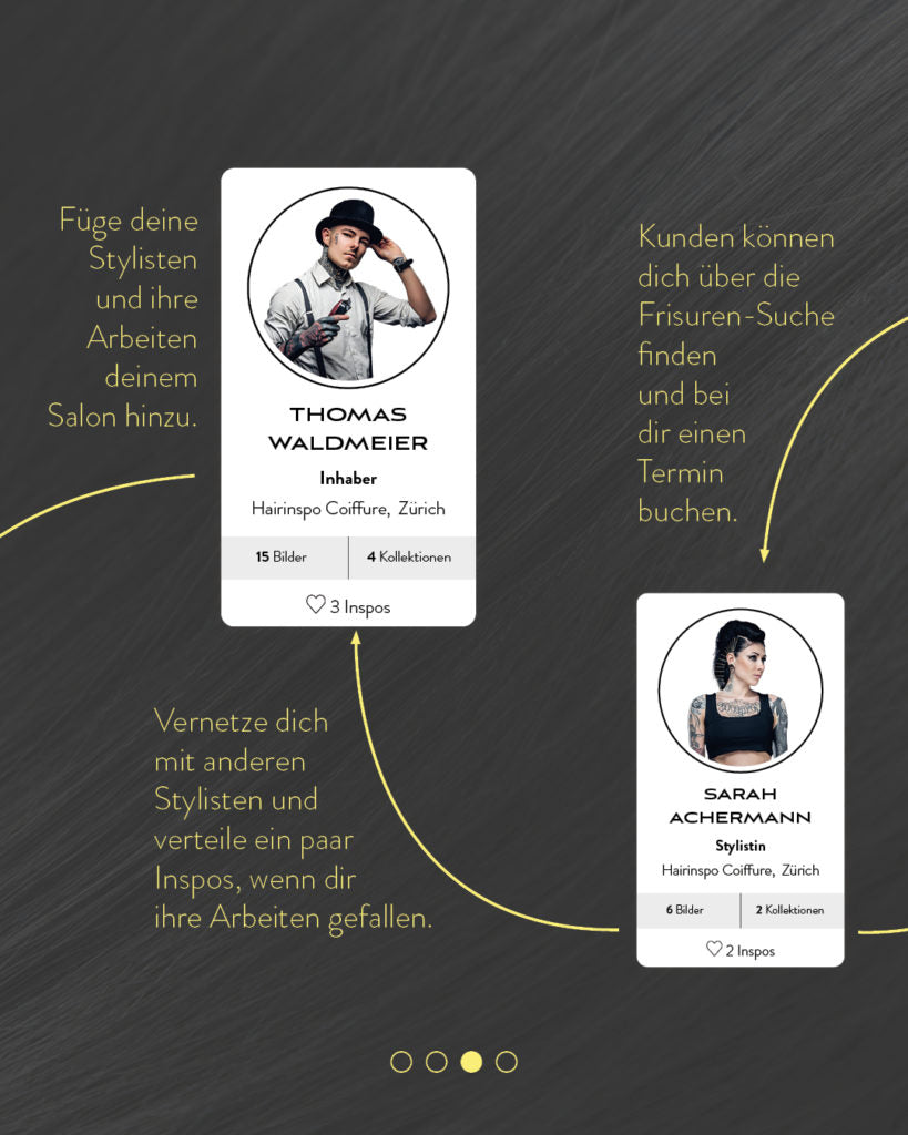 Mitarbeitende können ein Stylisten-Profil erstellen und sich mit dem Salon verknüpfen. Alle publizierten Kreationen werden mit Tags hinterlegt und automatisch auch in das Salon-Profil integriert. Die Reichweite eines Profils steigt, je mehr Profile miteinander vernetzt sind. Kreationen von anderen Profilen können mittels "Inspos" gelikt werden. Dadurch vergrössert sich das eigene Netzwerk sowie die Reichweite der Kreationen.