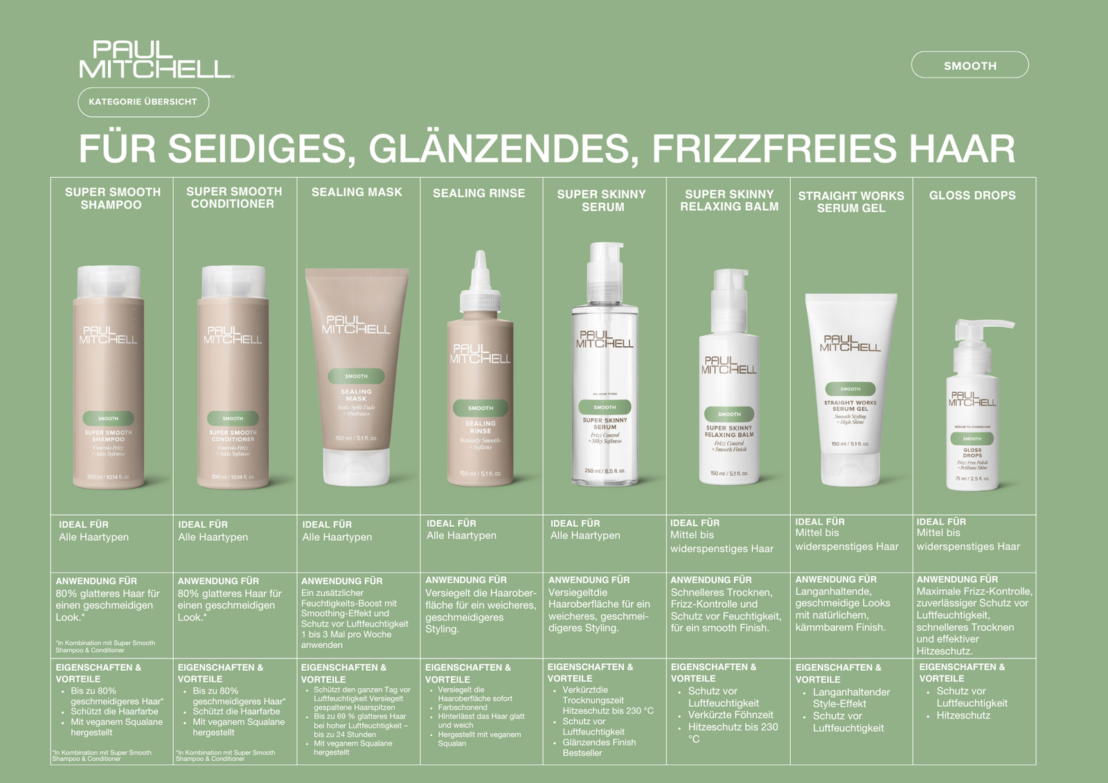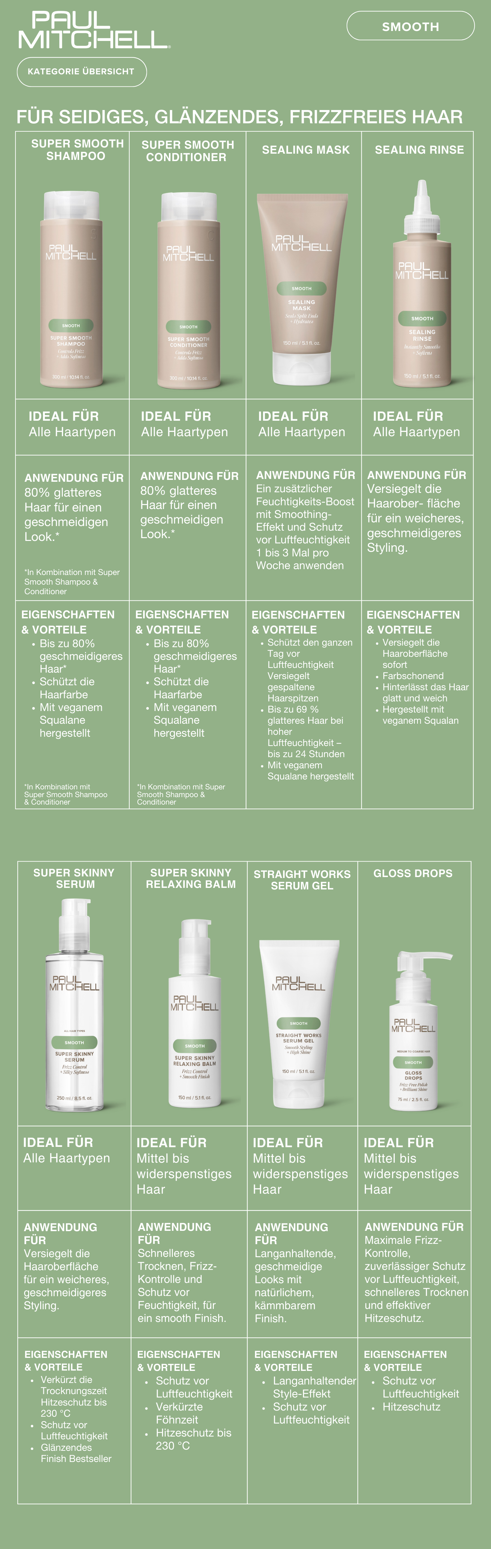 Für sichtbar glatte Tage: Diese ultra glättende Pflegeroutine wurde entwickelt, um Frizz zu bändigen, Spitzen zu glätten und strahlenden Glanz zu verleihen. Angereichert mit pflanzenbasiertem Squalan sorgt Paul Mitchell Smooth für bis zu 80 % glatteres Haar – für einen geschmeidigen Look.
